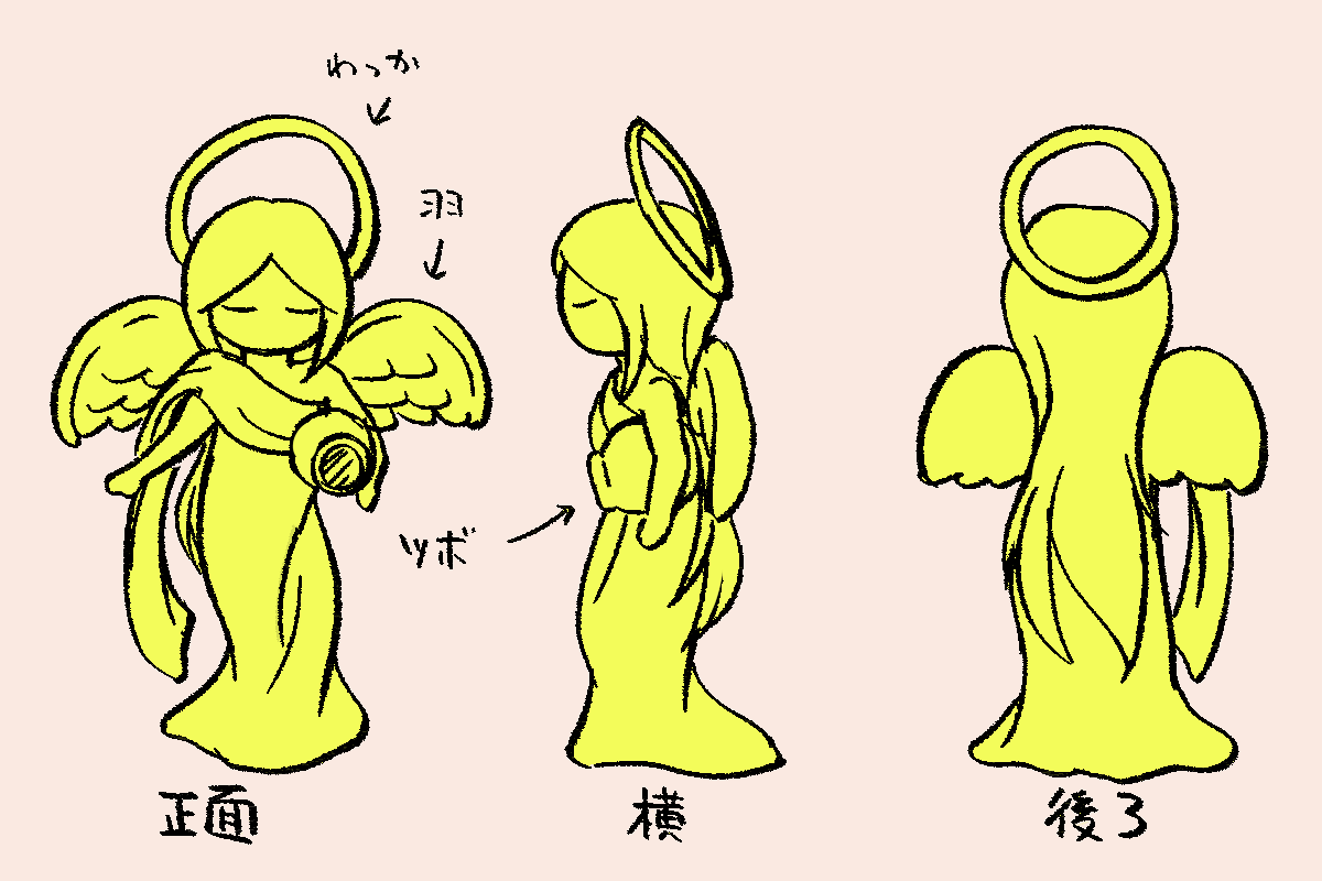 女神像に関しては、ゲーム画面だと不明な部分も多いので絵に起こして送ったのですが、