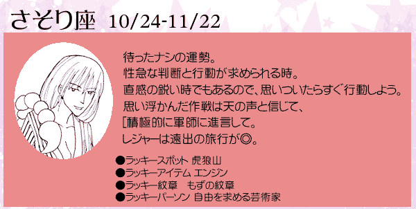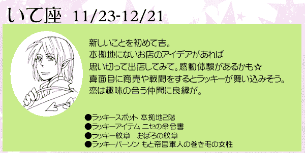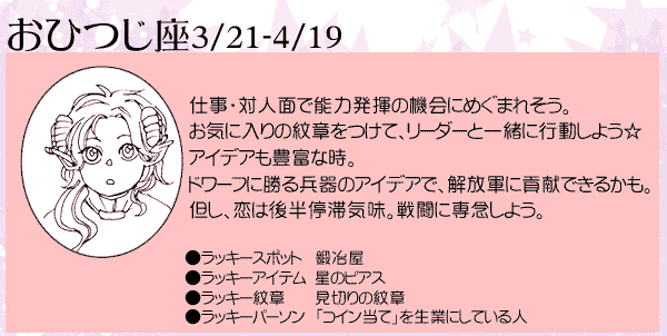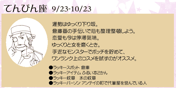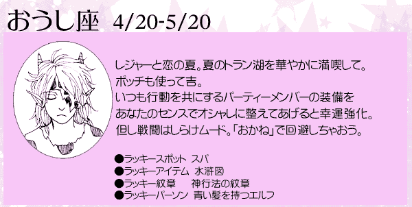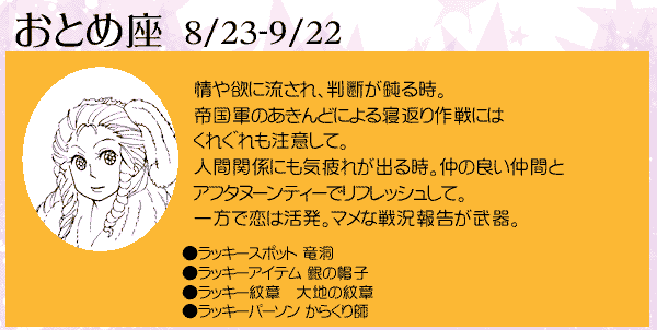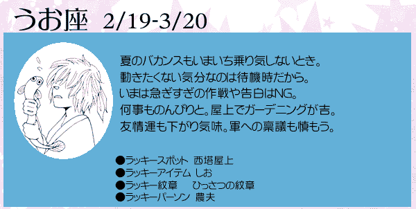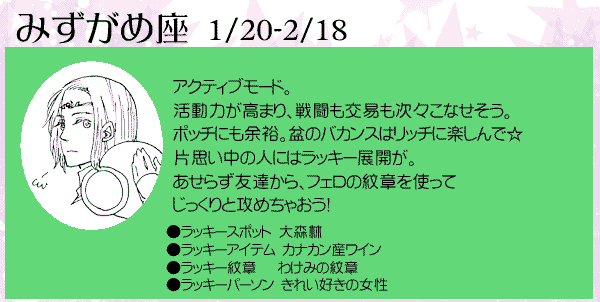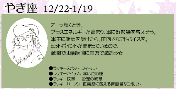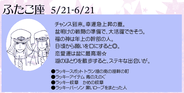 合作 幻水的星占い 2008年秋のギャグ本『ボン!キュ!!坊!!』に載せていた占い。 ヒカリバヤが妙に気合を入れて作成したものです。 ちなみに、本に載っていた際は『ヒカリパパイヤのKAIHO占い』というタイトルでした。 ■文章:ヒカリバヤ/イラスト:琴歌むい